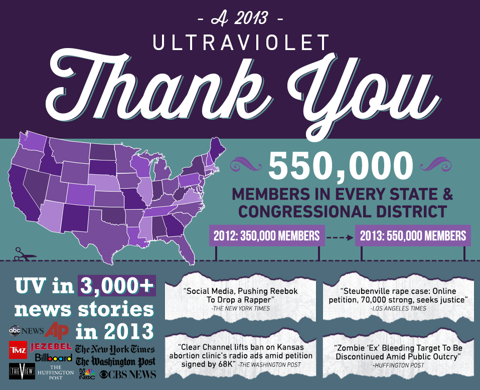 2013 has been a big year! We raised our voices together in some of the biggest fights for women, and we made real difference–and it’s all thanks to the 550,000 members of UltraViolet who spoke out and showed up.